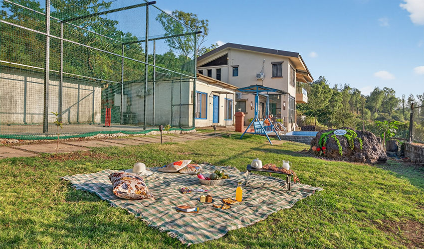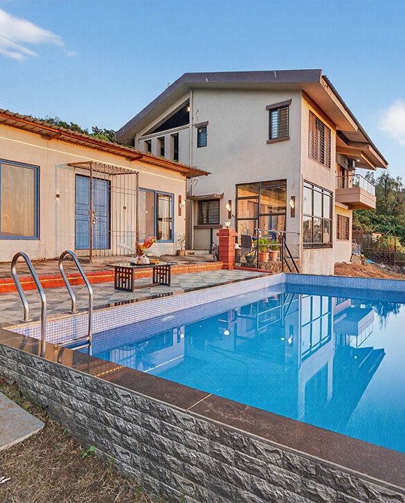 KoKo House offers a 5000 sq. ft. villa with 6 bedrooms, 6 bathrooms, 2 kitchens, private pool, lawn, bonfire pit, and parking for 4 vehicles – perfect for a relaxing and memorable Panchgani getaway.